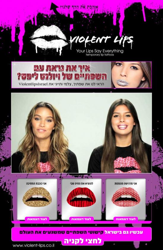 violent Lips מוצר: עיצוב אתר קונספט: עיצוב ובניה של אתר מכירה למוצר אמריקאי שהושק בישראל Violent Lips מוצר: מדבקות שפתיים קופי: שגעון השפתיים קונספט: מיתוג ישראלי למוצר אמריקאי violent Lips מוצר: שילוט חוצות ענק באילון קופי: שגעון השפתיים violent Lips מוצר: דף מוצר בפייסבוק violent Lips מוצר: מיתוג רכבים